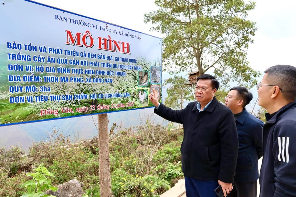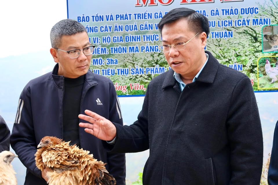 Từ lâu, xã Đồng Văn được biết đến là địa phương có nhiều giống gà bản địa với chất lượng thịt thơm ngon, đặc biệt là giống gà đen nổi tiếng trong và ngoài tỉnh. Gia đình anh Đinh Đức Thuận, là người vùng xuôi lên kinh doanh du lịch cộng đồng tại địa phương nhiều năm, anh nhận thấy hiện nay nhu cầu của du khách đến địa bàn rất thích ăn gà đen bản địa. Tuy nhiên do lượng khách du lịch đến Đồng Văn ngày một tăng cao, nên số lượng gà đen các hộ dân nơi đây nuôi với số lượng manh mún và nhỏ lẻ, nên số lượng gà rất ít, chưa đáp ứng được nhu cầu của các đơn vị kinh doanh phục vụ du khách, thậm chí để mua được con gà đen hiện nay là rất hiếm. Thấy rõ được nhu cầu đó, để bảo tồn và nhân rộng giống gà địa phương, trở thành một sản phẩm du lịch. Ngay từ đầu năm 2025, anh Thuận đã quyết định đầu tư vào lĩnh vực chăn nuôi gà theo hướng chăn thả tự nhiên tại 3 ha đất vườn của gia đình. Thức ăn của gà sử dụng thức ăn có pha trộn dược liệu sẵn có ở địa phương, với mục đích xây dựng thương hiệu gà dược liệu Đồng Văn.