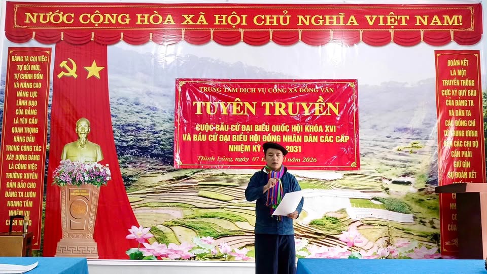 Xã Đồng Văn là địa phương vùng cao, giáp biên giới Trung Quốc với trên 90% đồng bào dân tộc thiểu số sinh sống. Để lan tỏa thông tin về cuộc bầu cử đến mọi tầng lớp Nhân dân, xã Đồng Văn đã chỉ đạo Trung tâm dịch vụ công xây dựng kế hoạch tuyên truyền, trong đó, đẩy mạnh tuyên truyền bằng hai ngôn ngữ Tiếng Việt và Tiếng Mông để đến được với đa số người dân. Bên cạnh đó, các hoạt động tuyên truyền cổ động trực quan như: pa-nô, áp-phích, băng-rôn, khẩu hiệu, các hoạt động văn hóa, văn nghệ, thể thao… cũng được tổ chức thường xuyên.